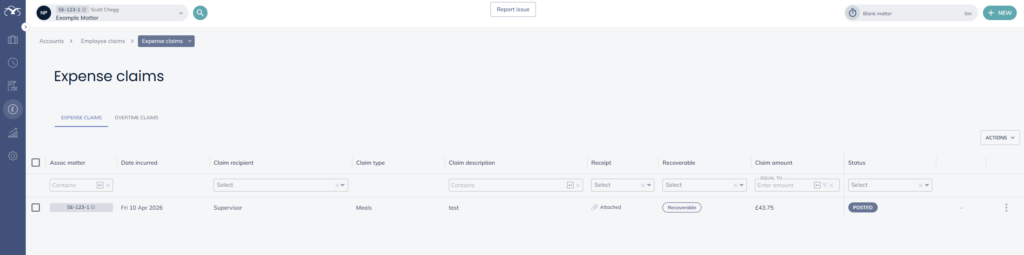 Recoverable – If you tick Recoverable, a posting will be made on the client ledger so that it can be picked up on a bill, as well as on the corresponding nominal ledger. An expense voucher document is also added to the matter history if a claim is added as recoverable along with any attached receipts.