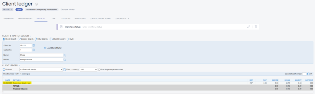 – If there is an associated client/matter and the claim was ticked as “Recoverable” then a posting will be made on the client ledger for that matter. It will be posted as a DISBNOM.