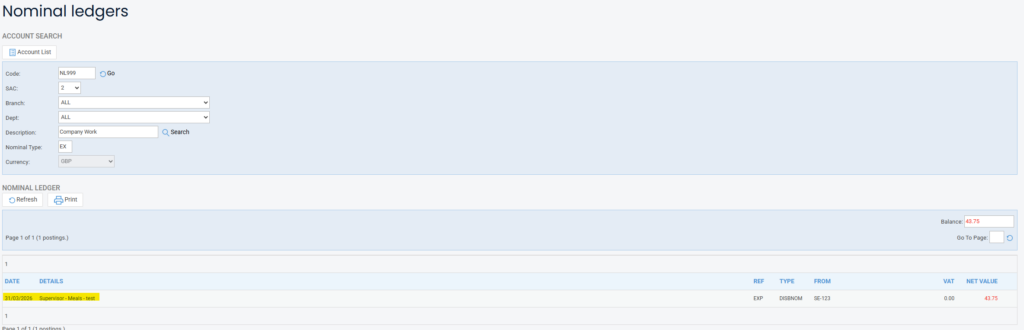 There will also be a posting to the Nominal Ledger that is attached to the claim type e.g. for the MEALS claim type it will post to the nominal you have linked to it, for example the Meals Nominal.