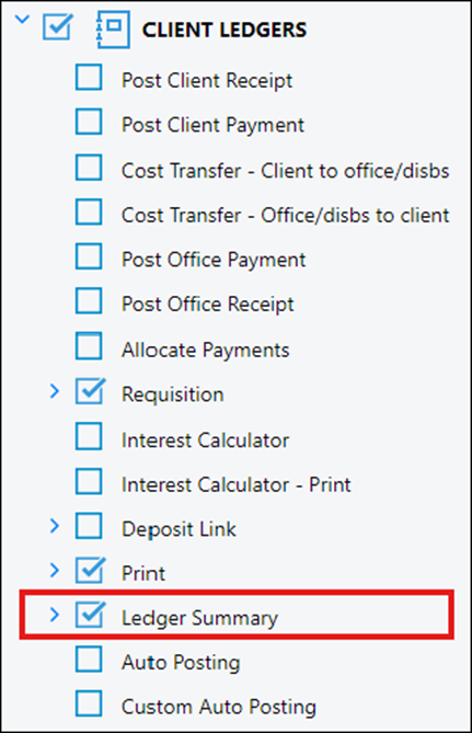 Please note that AT LEAST ONE BOX must be ticked in the Client Ledger sub-headings to allow it to be viewed. We would recommend that the Ledger Summary box is ticked to allow this.