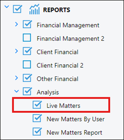 To allow the matter tables to export the results of a matter search to a CSV file, ensure that the Live Matters box is checked under the Analysis section of Reports.