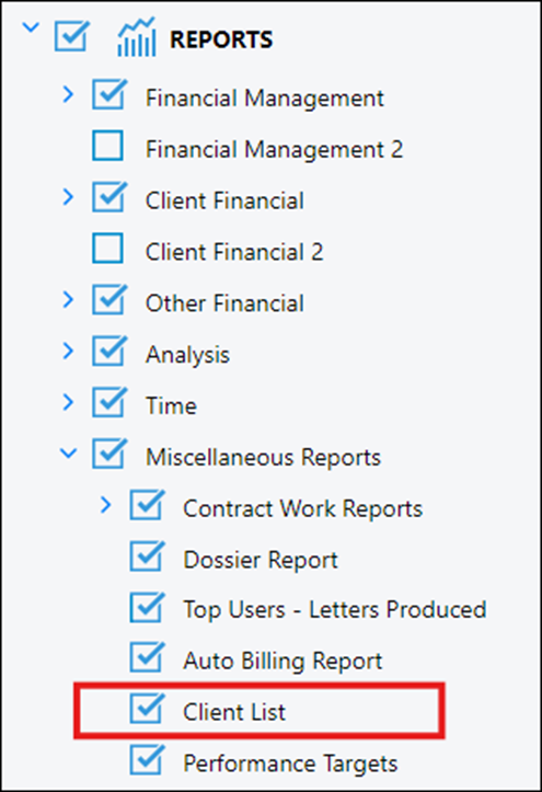 To allow the client tables to export the results of a client search to a CSV file, ensure that the Client List box is checked under the Miscellaneous Reports section of the Reports area.