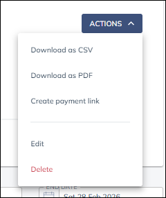 The actions button in the top right and corner allows you you choose from Download as CSV, Download as PDF, Edit and Delete.