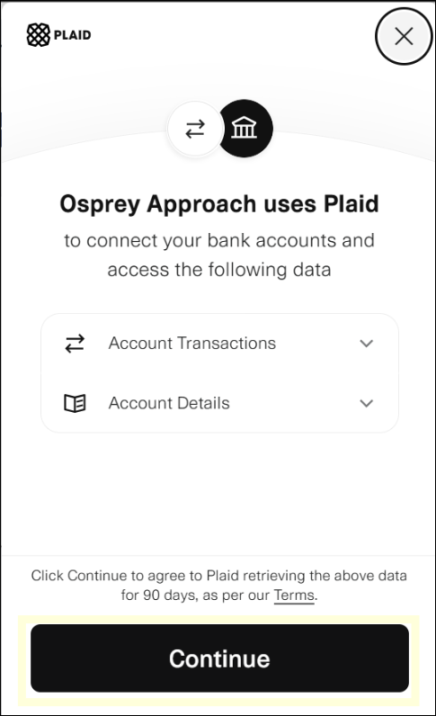 Click continue to allow Osprey Approach to use the Plaid service to connect to your bank