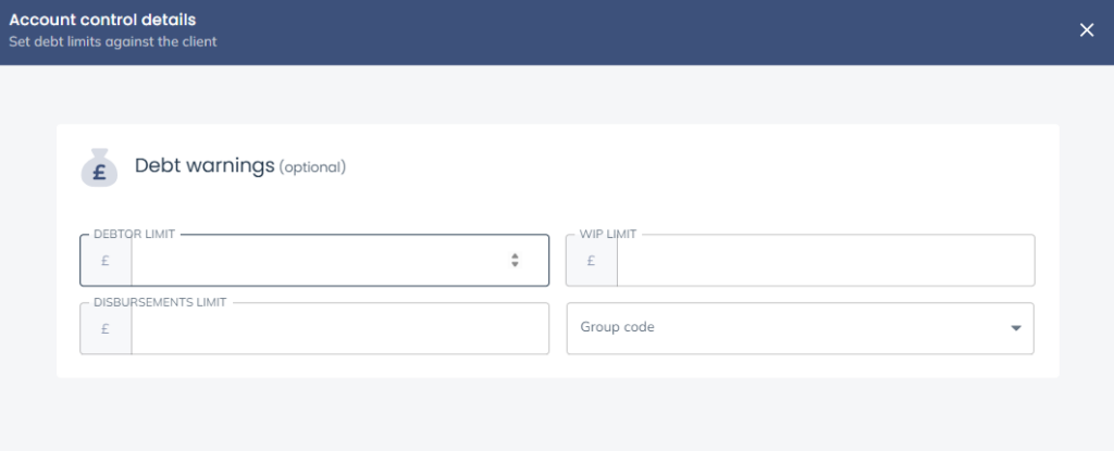 Debtor, Disbursements and WIP Limits: If you wish, enter credit limits here for the matter. Warnings will be triggered by default at 75% of the limit set when time recording (for WIP limit) or entering financial postings (for Debtors/Disbursements limits).