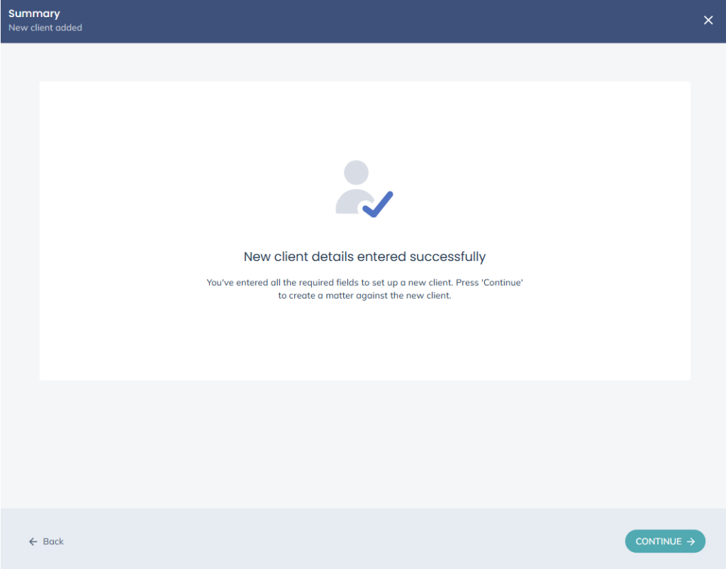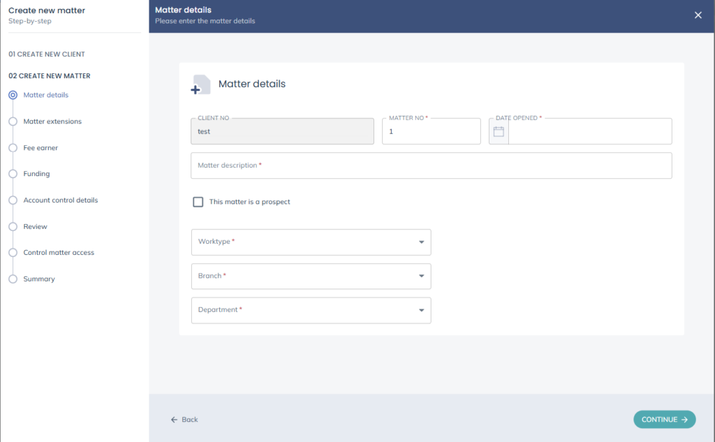 Enter the details as relevant, and then select Continue to move on to creating a new matter.