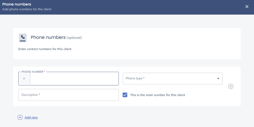 Select Add New to add any phone, fax, mobile or DX numbers you have for the client.