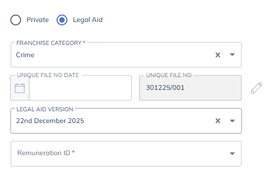 Private or LA: Select from Private or Legal Aid. If the matter is set to Legal Aid, additional options will appear: