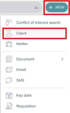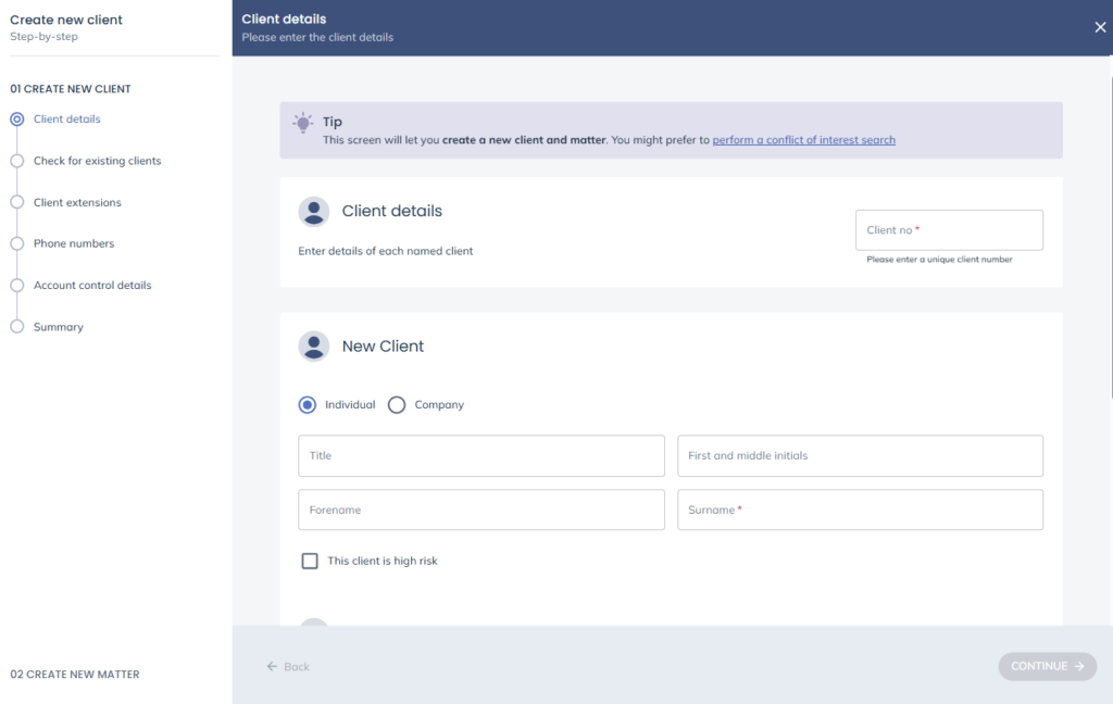 Client and Matter No: These will be pre-populated. As we are adding a new client, the matter number will default to 1.