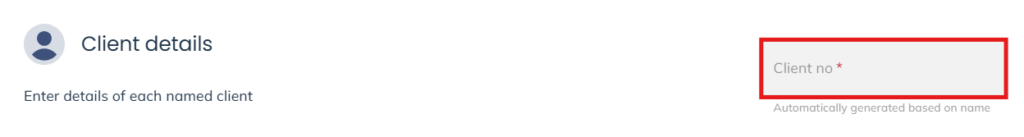 If the Client No box is blank, this means that your supervisor has not switched on automatic client numbering, so you will need to enter a client number. If the Client No box is greyed out as shown below, the client will be automatically assigned a client number based on the settings your supervisor has set within the system.