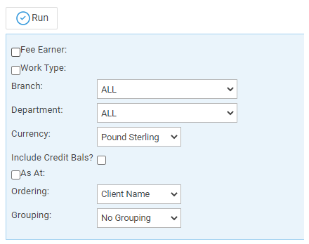 - Grouping – Options of No Grouping, Fee Earner or Work type. A new page is started for each Fee Earner or Work type and subtotals are given per grouping