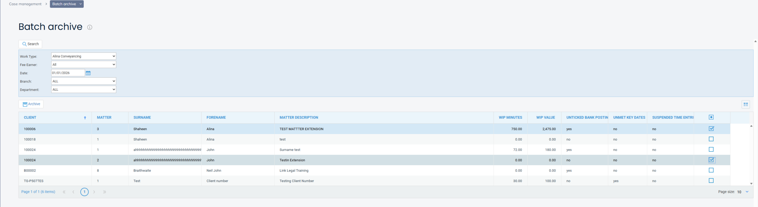 Once you have made any selections here, click the Search button. You must at least have filled in the date field. The system will search for any matters which can now be archived, and display them, noting whether there is any WIP, unticked bank postings, unmet key dates or suspended time entries: