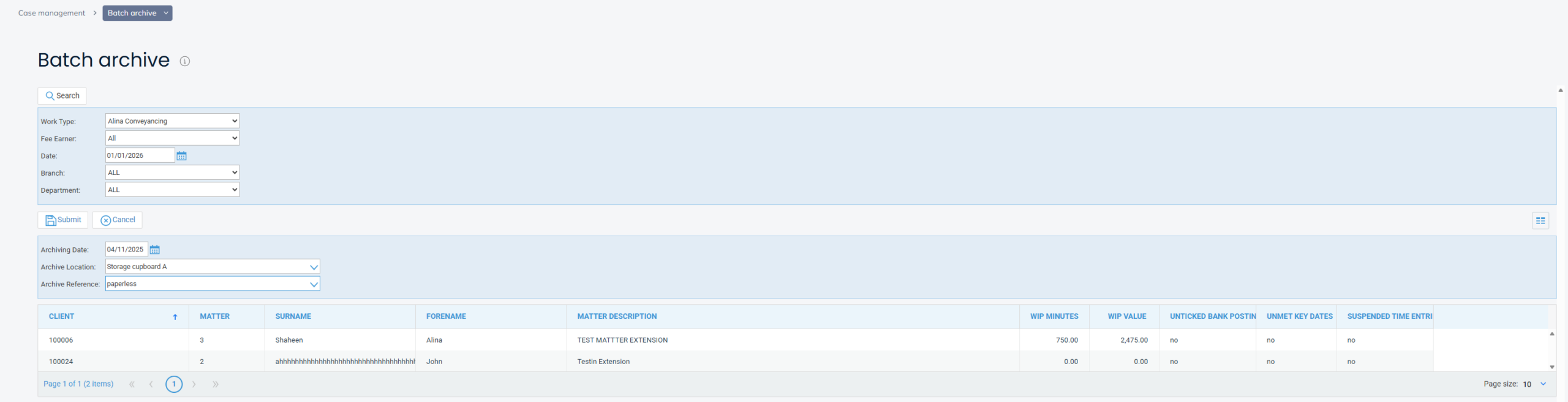 Once a matter has been completed for a client, you can archive it. This should be done as part of your general housekeeping. Archiving can be done on a matter by matter basis or via the Batch Archive facility.