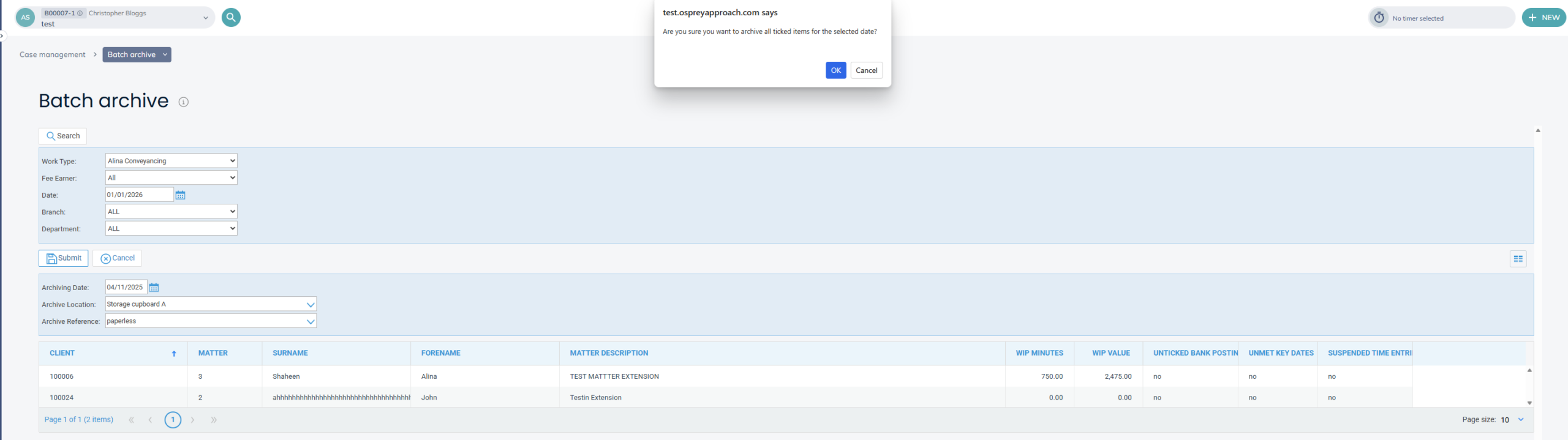 Osprey will now display just the matters you selected, and allow you to enter their Archive Date, Location and Reference. Click Submit once you have entered these.