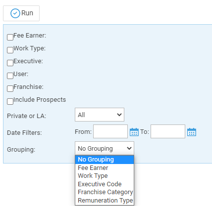 - Fee Earner – shows a listing with the filters selected and additionally groups matters for Fee Earners together