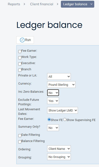 - Run the Ledger Balance Report – Reports > Client Financial > Ledger Balance and ensure that Exclude Future Postings is set to Yes: