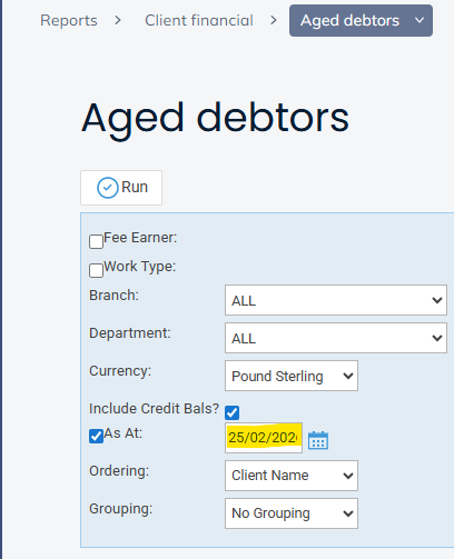- Run the Aged Debtors Report – Reports > Client Financial > Aged Debtors and ensure that Include Credit Bals? and As At are ticked. In the box alongside As At, enter the period end date for the month you want to compare to the Trial Balance/Ledger Balance.