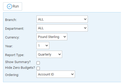 Ordering – choose to order your report by Account id (nominal code) or Account name (nominal description).