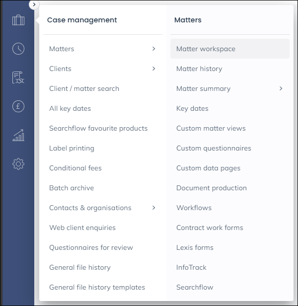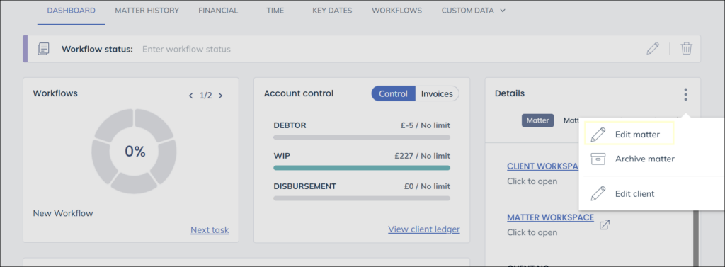 If the matter in question has zero balances in all columns of the ledger card, you can simply navigate to Case management > Matters > Matter workspace