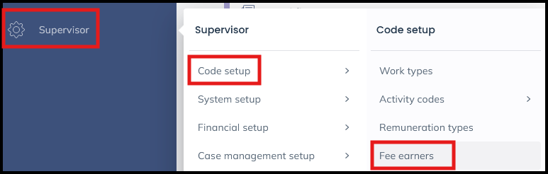 To set this, navigate to the ‘Supervisor’ area of Osprey, then select ‘Code Setup’ and then click on ‘Fee Earners’.