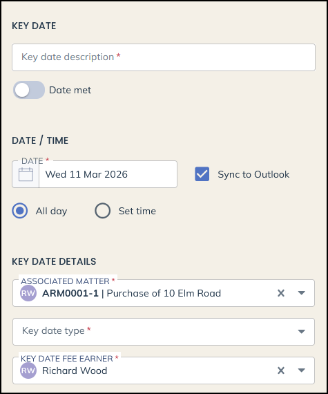 As with the tasks detailed earlier, search for your client and matter, and then enter the fee earner and key date type details. Tick the box if the date is already met and you just want to record it, or leave blank if you want it to appear as unmet in Osprey.