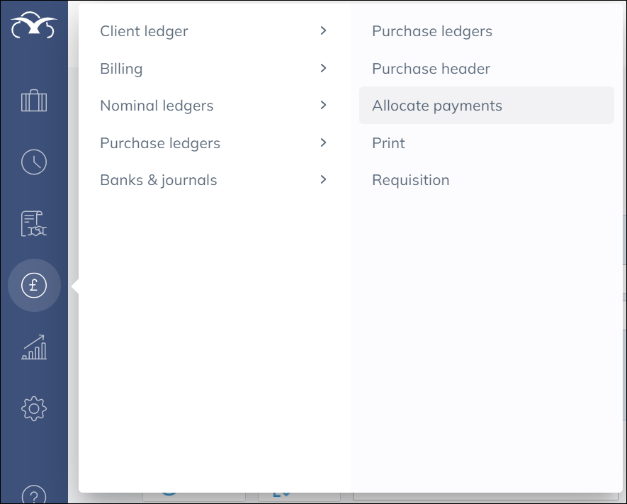 To clear the allocations on a purchase ledger, navigate to the Accounts menu, then Purchase ledgers and Purchase ledgers again, select the purchase ledger you require, and then choose Allocate Payments from the left hand menu: