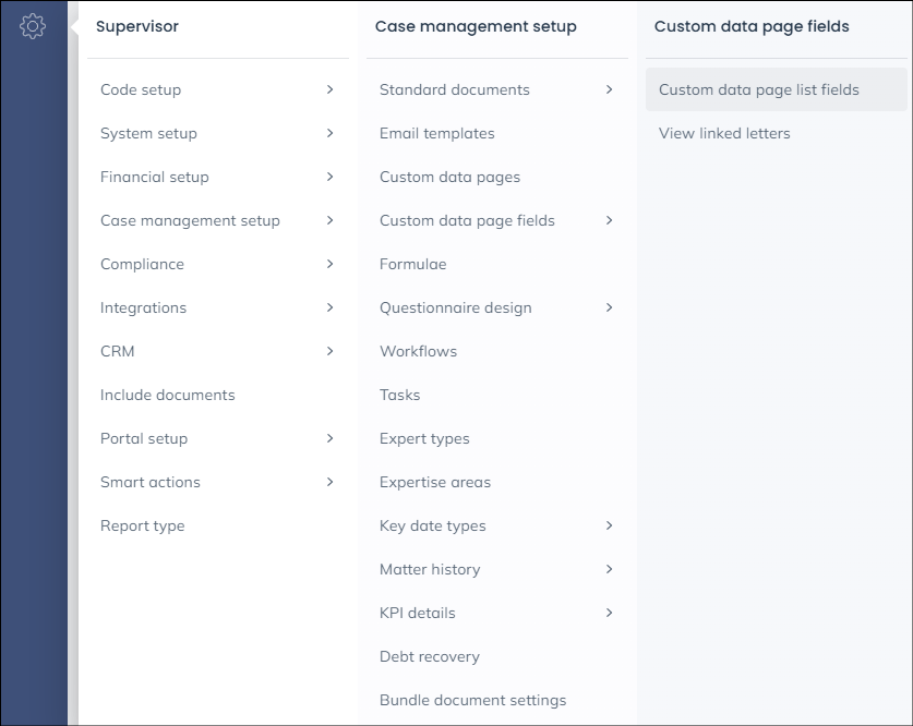 Navigate to the ‘Supervisor’ area within Osprey and select ‘Case Management Setup’ followed by ‘Custom Data Page Fields’ and then ‘Custom Data Page List Fields’.