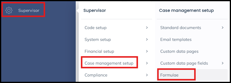 Navigate to the ‘Supervisor’ area of Osprey and select ‘Case Management Setup’. Now select ‘Formulae’.