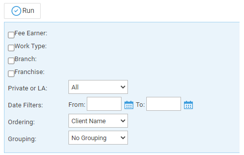 - Fee Earner – reports in the order chosen above, but with each fee earners’ matters grouped together.