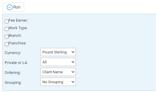 - Fee Earner – This will produce the report in client number order, grouped into matter fee earner.