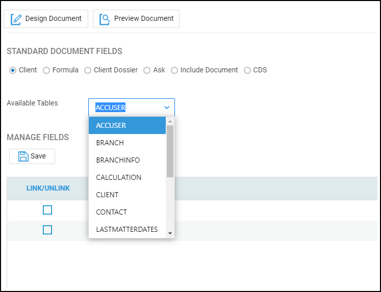 Should you wish to add additional merge fields into the letter, you will need to locate these. You will need select one of the options in the drop down box to locate the relevant table and then link the fields below using the checkboxes and clicking save