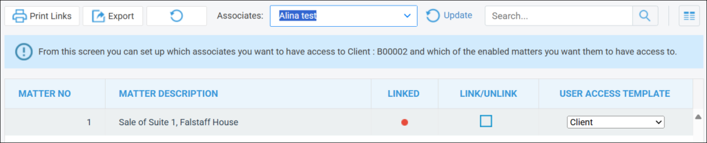 Firstly, select an Associate from the ‘Associates’ list. Click the Link/Unlink check box to select which matters you wish to Publish to the selected Associate and then link a suitable User Access Template.