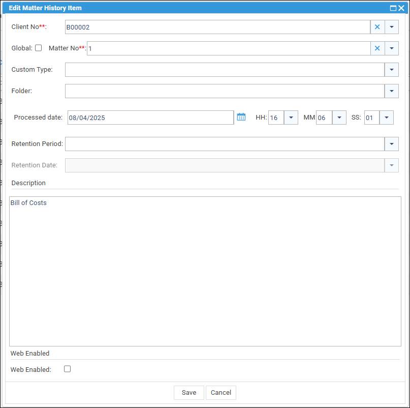 Any type of document saved within a client’s matter history can be Web Enabled and then made visible to a client and any linked Associates via the Web Portal.