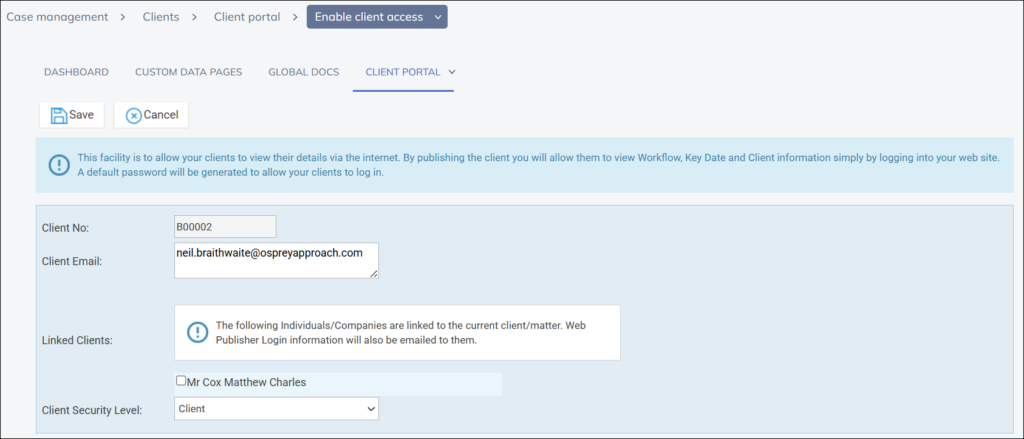 Once you have selected enable access, select a suitable Client Security Level and click ‘Save’. The client will then receive an automated email with their login credentials.