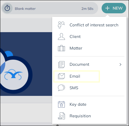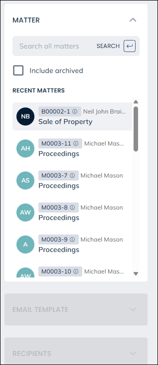 Once a client is selected, you can access any email templates, email addresses, matter history items or packages to bring into your email.