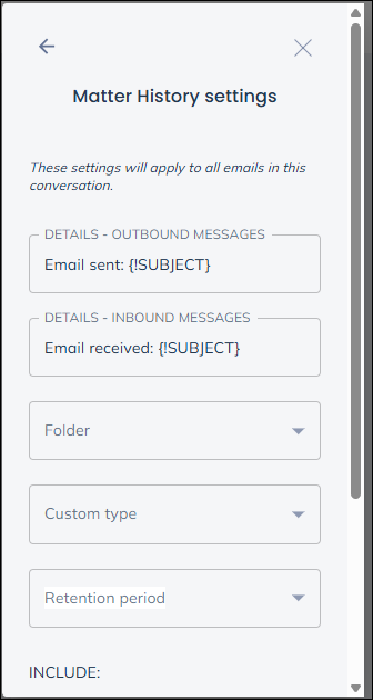 Here you can review how the message will be saved. Choose folder to select a matter history folder to save the message to, Choose Custom type to set a document type for matter history. Choose Retention period to set how long the message must be kept for.