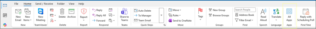 To install the add-in, open Outlook, navigate to the Home tab and select All Apps.