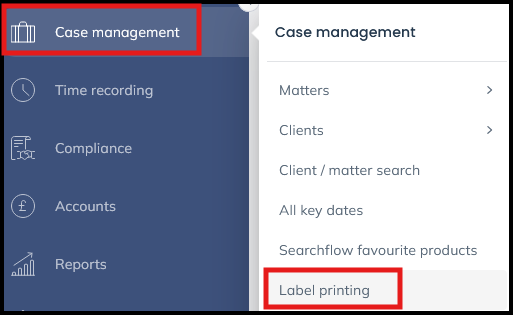 To print matter labels, Select Case management > Label Printing: