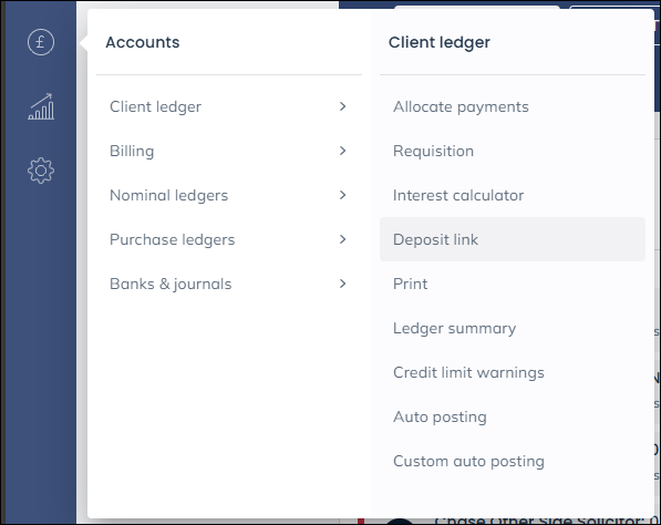 Ensure that you have a client and matter selected, then select the ‘Accounts’ tab followed by ‘Client Ledger’. Now click the ‘Deposit link’ option.