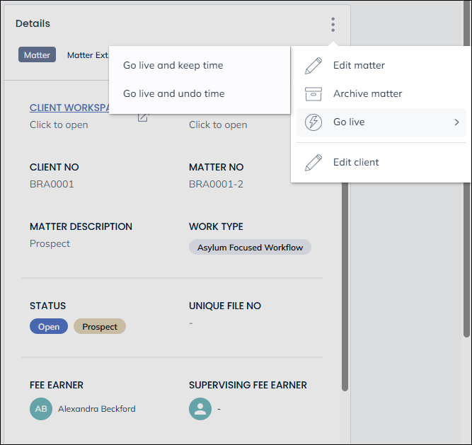In order to make the prospect file live, you simply need to decide if you are going to write off any time associated with the file (Go live and undo time) or bring it through to the live file (Go live and keep time).