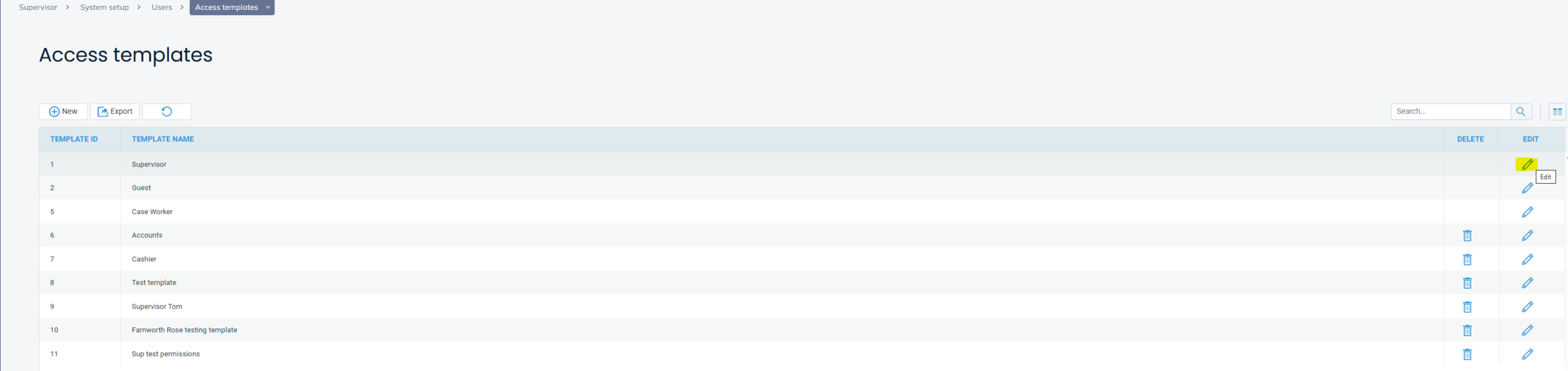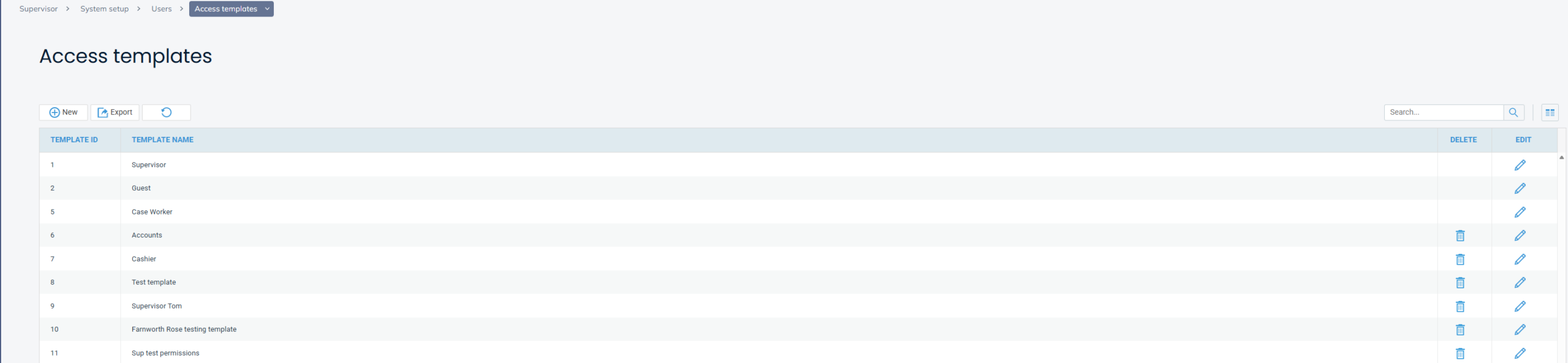 Firstly, check the access templates you have in use currently. This can be done from Supervisor > System Setup > Users > Access Templates.