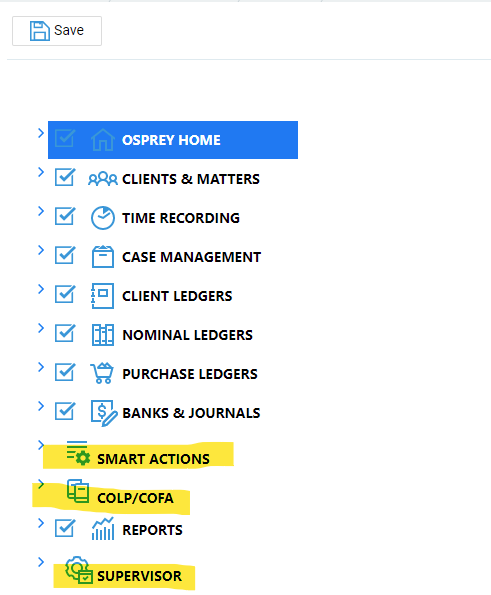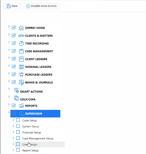 If there is no check box alongside the area, as highlighted below, this means that the template does not have any access into that area at all (so any user linked to this template will not see the menu when they log in).