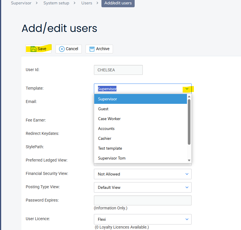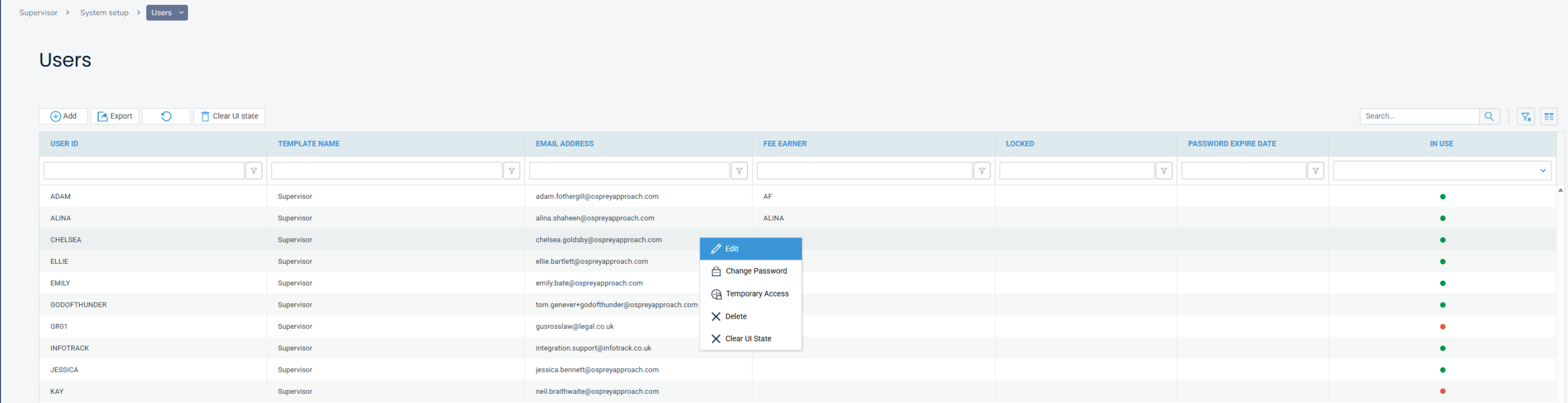 Navigate to Supervisor > System Setup > Users. Right click the user you wish to amend the access for, and select Edit.