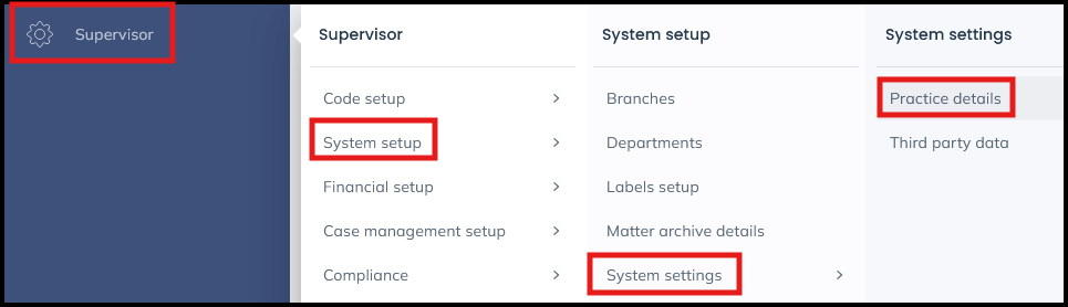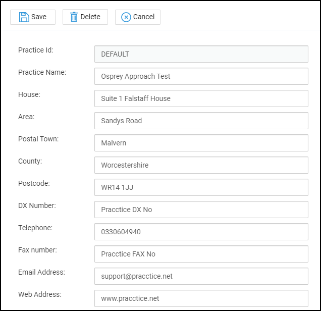 To view your firm’s current details stored within Osprey, go to Supervisor > System Setup > System Settings and select Practice Details.