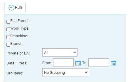 - Fee Earner – Tick this box if you want to show only one or a selection of fee earners, or leave blank for all