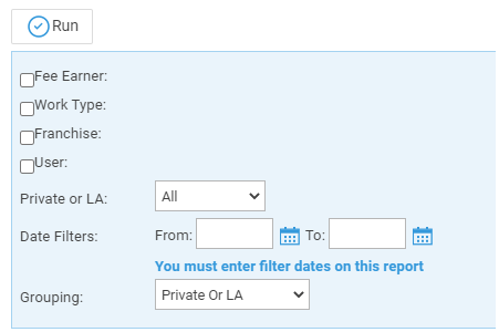 - Private or LA – If left on All, this will show both Private and Legal Aid clients matters. You can choose to show only Private or Legal Aid clients by selecting the appropriate option.