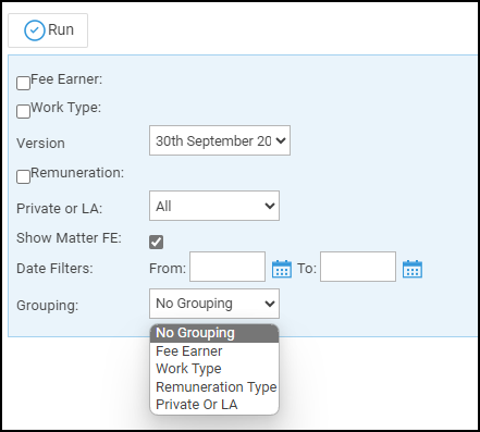 - Private or LA – This will produce the report in client number order, grouped and subtotalled by whether the matter is private or legal aid.