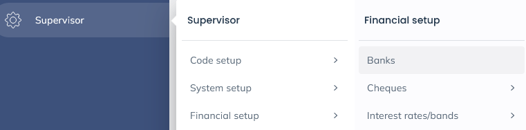 Navigate to Supervisor > Financial Setup > Banks > Add Bank.