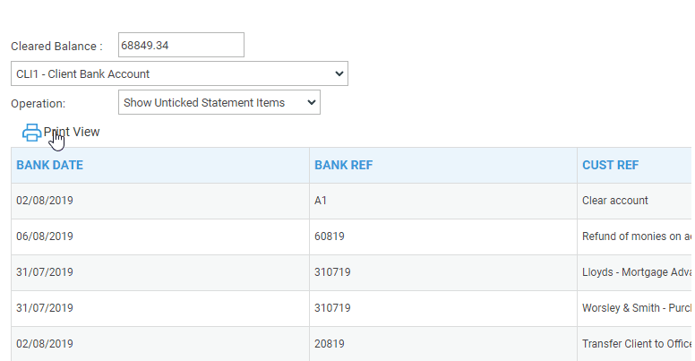 - Show Cleared Statement Items – This shows all ticked items on the bank.