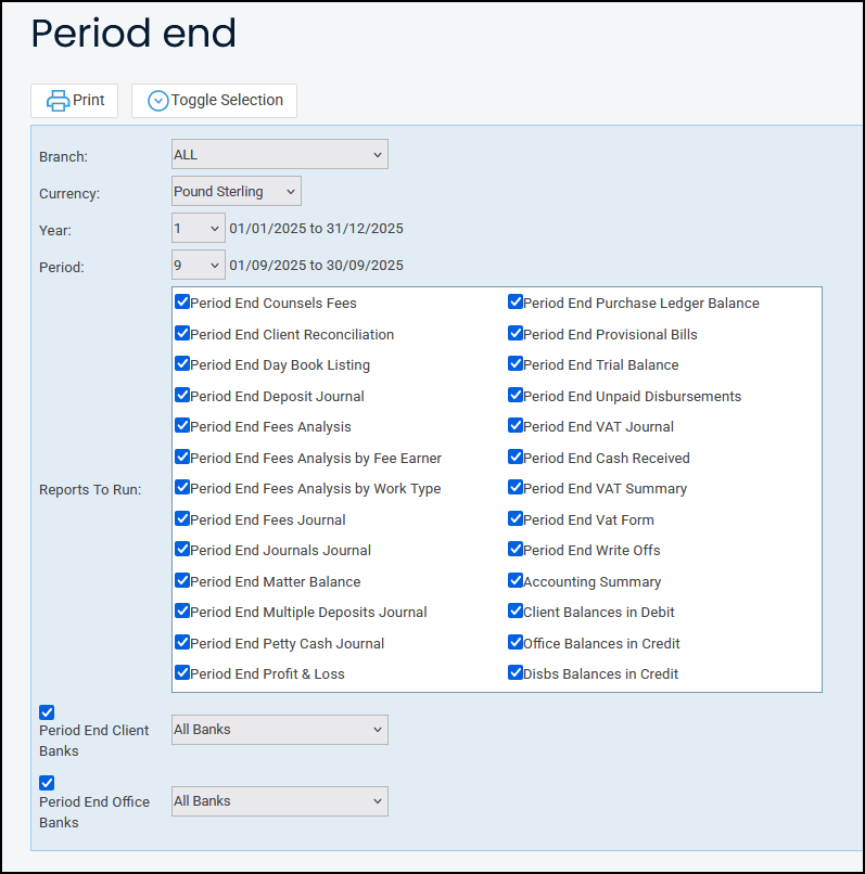 - Period – List selection of the period ends that have been run for the year selected above.